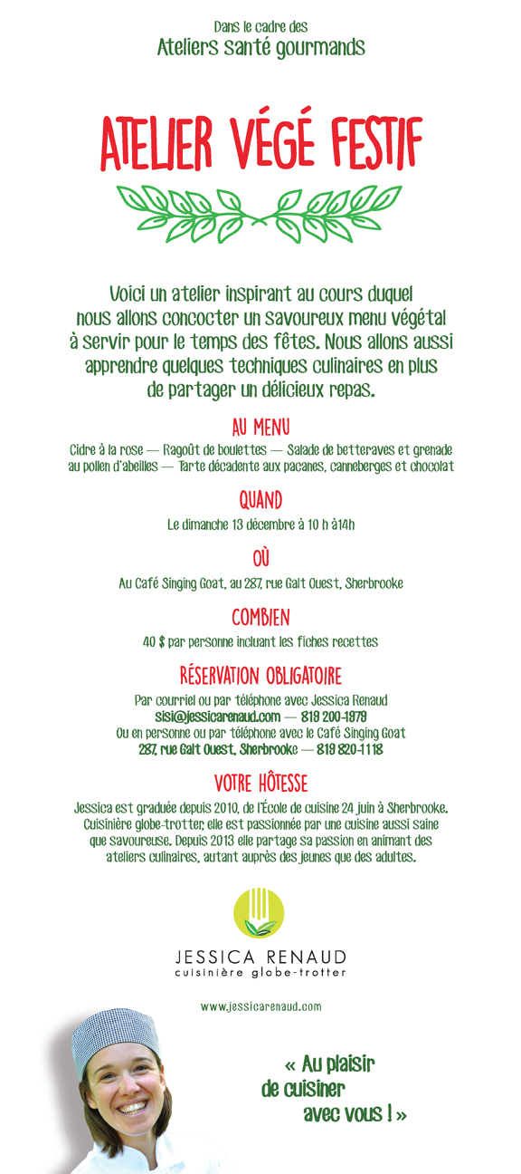 Jessica cuisine depuis toujours. Elle est graduée depuis 2010, de l'École de cuisine 24 juin à Sherbrooke. Cuisinière globe-trotter : elle est passionnée par une cuisine aussi saine que savoureuse. Depuis 2013 elle partage sa passion en animant des ateliers culinaires, autant auprès des jeunes que des adultes.